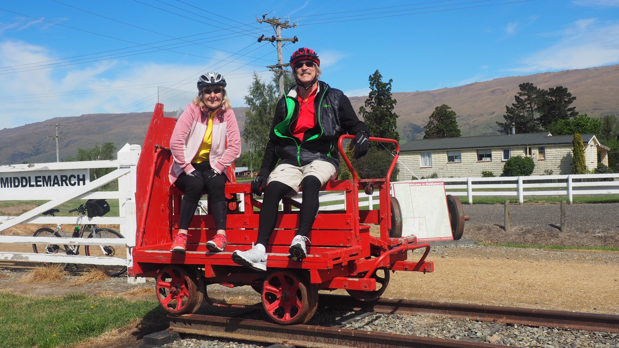 The trail ends at Middlemarch because from there to Dunedin, the railway still exists. We saw the Taieri Gorge Train arrive, pulled by two huge diesel locos.