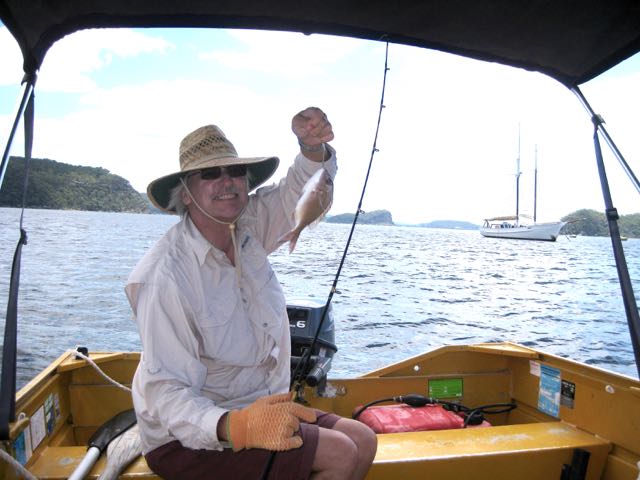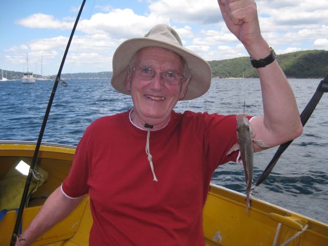 At Martin’s request, today we rented a little boat and went fishing on Pittwater. Fabulous weather – 26 degrees and sunny. We caught lots of fish, all just too small to keep and eat. Martin had a big flathead on the hook (60cm!) but as we tried to get in into the boat it bit through the line and escaped. Bugger! The one that got away.IMG_0855