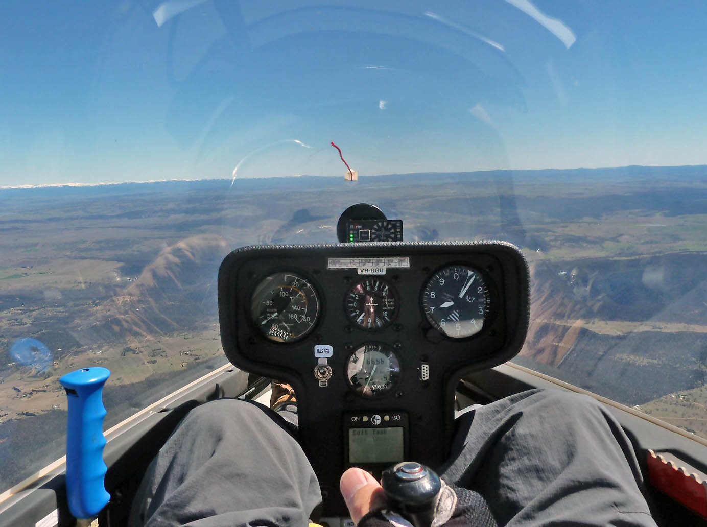 I achieved a personal best height of 9200 feet in difficult thermals with several climbs to that height and a great view of the white caps on the Snowy Mountains in the distance.
