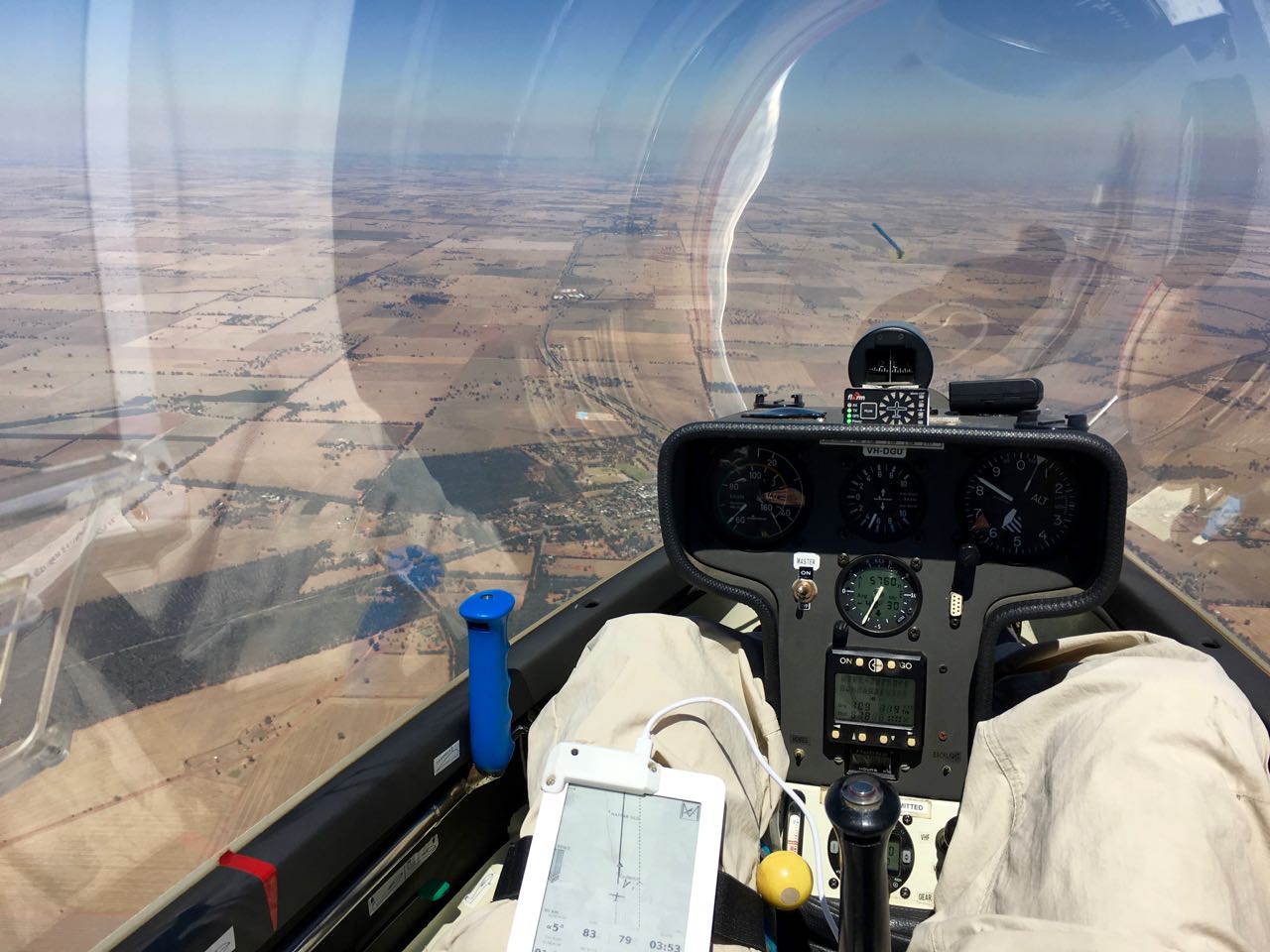 Yes, 1600k is a long way to fly. But that was over four flights, not one. I spent nine days this month at the NSW country town of Cootamundra where my gliding club was holding its annual camp. We had good cross-country gliding weather with thermals up past 12,000 feet on some days.