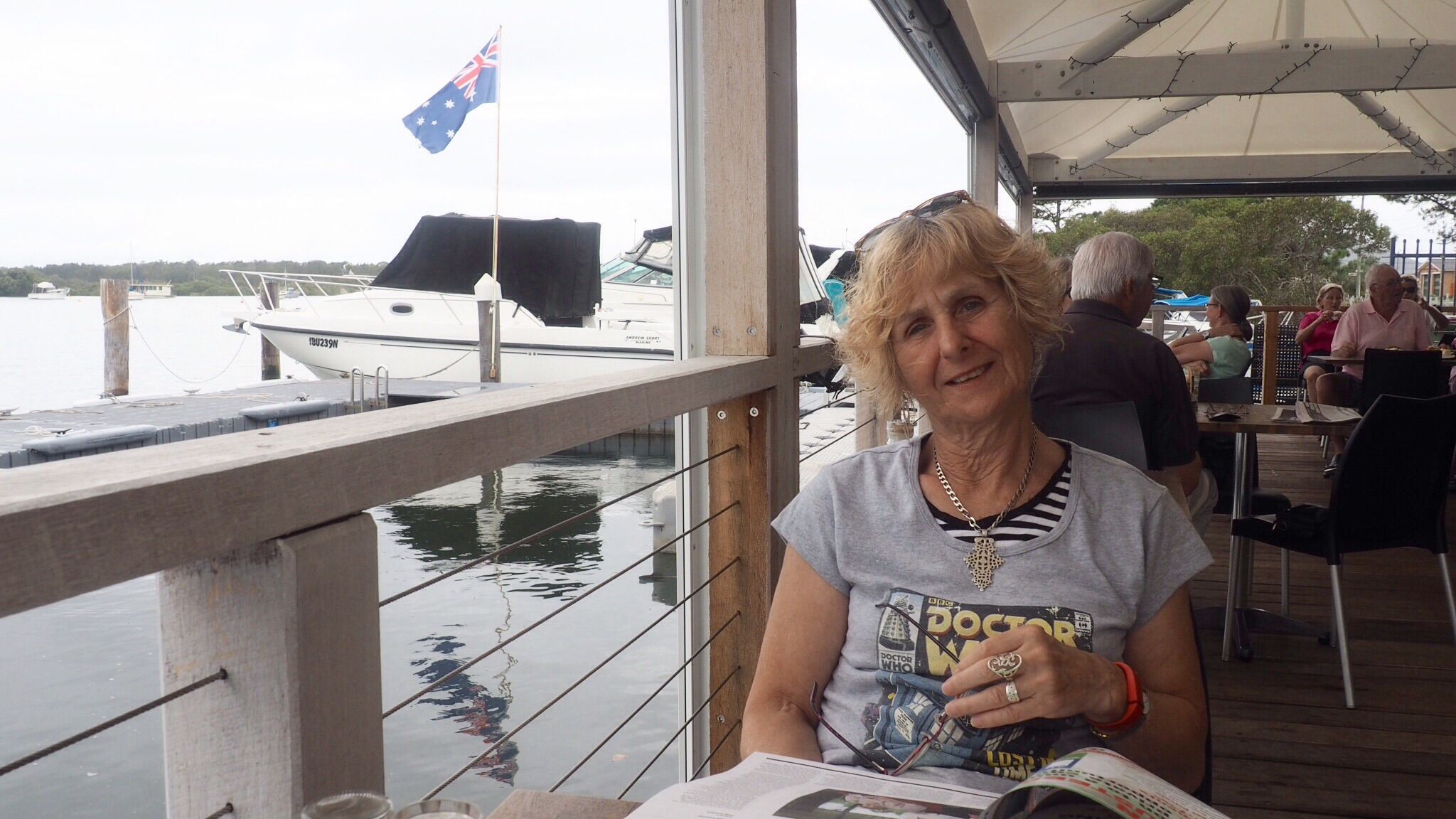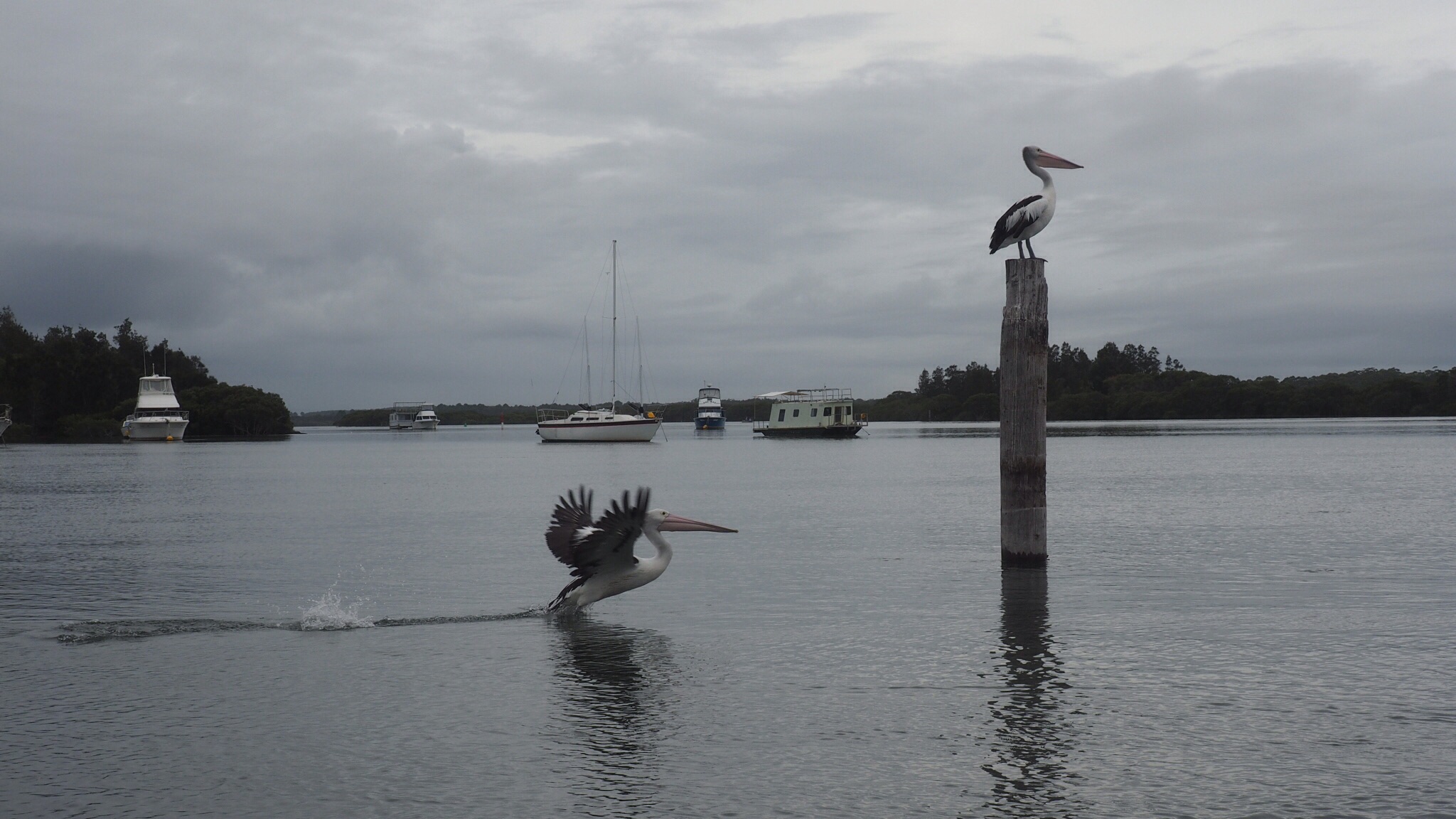– brunch at the Boatshed cafe. Bacon and poached eggs for me, Jan had something with green slime all over it – probably avocado. The tatty old boatshed has had a makeover with its waterside verandah extended. The food and coffee are very good and the genus loci hard to beat. We then wandered along the riverfront at Tea Gardens and watched the pelicans. I took lots of pelican pix.