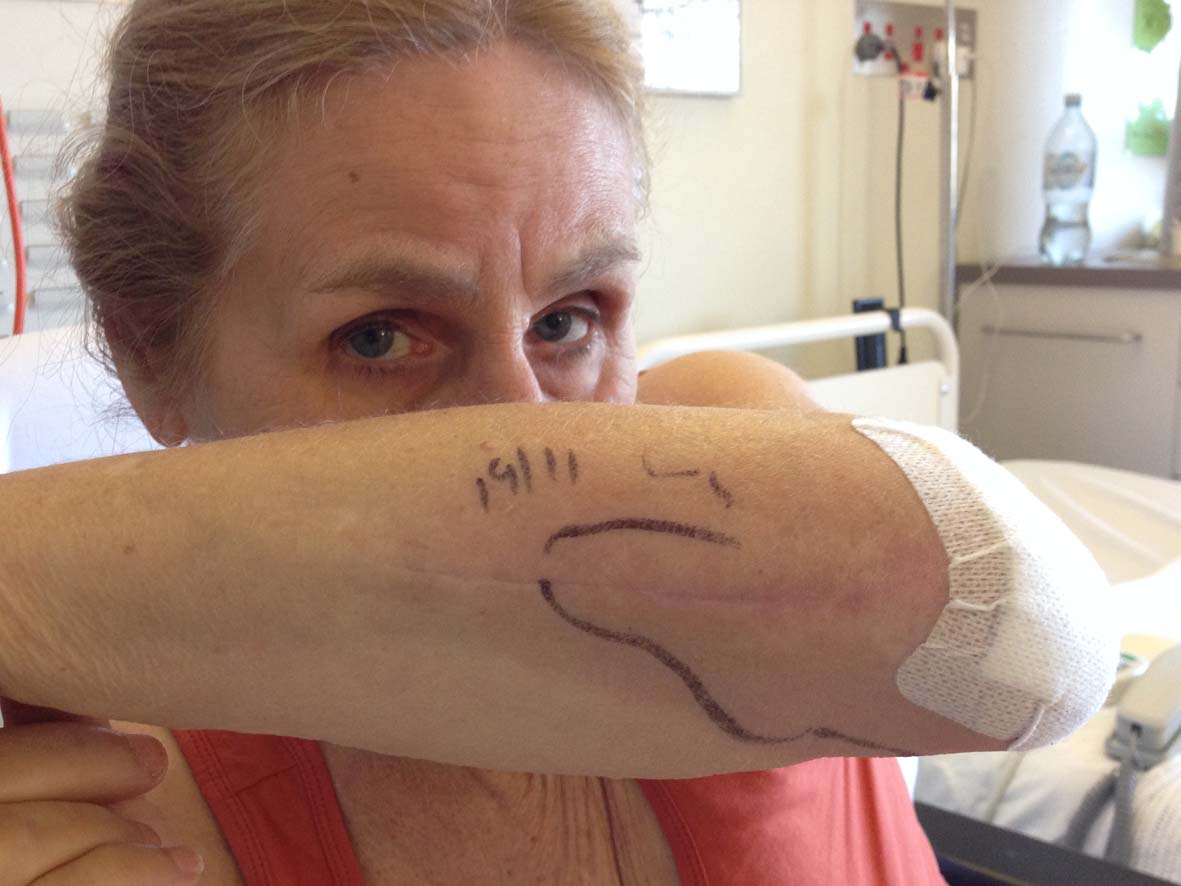 They’ve been filling her full of antibiotics – vancomycin and flucloxacillin intravenously. But then the skin redness showing the infection site spread beyond the area they’d marked on her arm when she came in (see pic) and they decided they had to cut into the arm and clean it out. She’s in good spirits and wanted to show the world her arm situation!