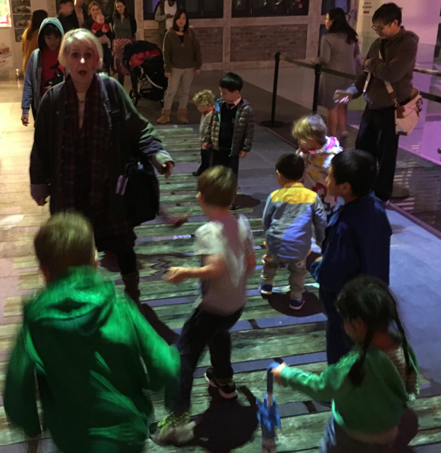 Outside there were more projections in the pedestrian precinct. One was a jungle complete with flowing river, fish, lizards and dinosaurs. There were also, to Viv’s dismay, some very realistic-looking snakes slithering among the trees. Again, lots of little kids were having a terrific time stamping on all the creatures underfoot.
