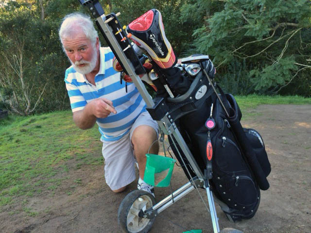 Norman took his huge club and let fly a mighty whack. The ball went off to the left and smacked into the sand bucket hanging from my golf bag with a loud bang and huge explosion of sand. The bucket did not survive. Oops!