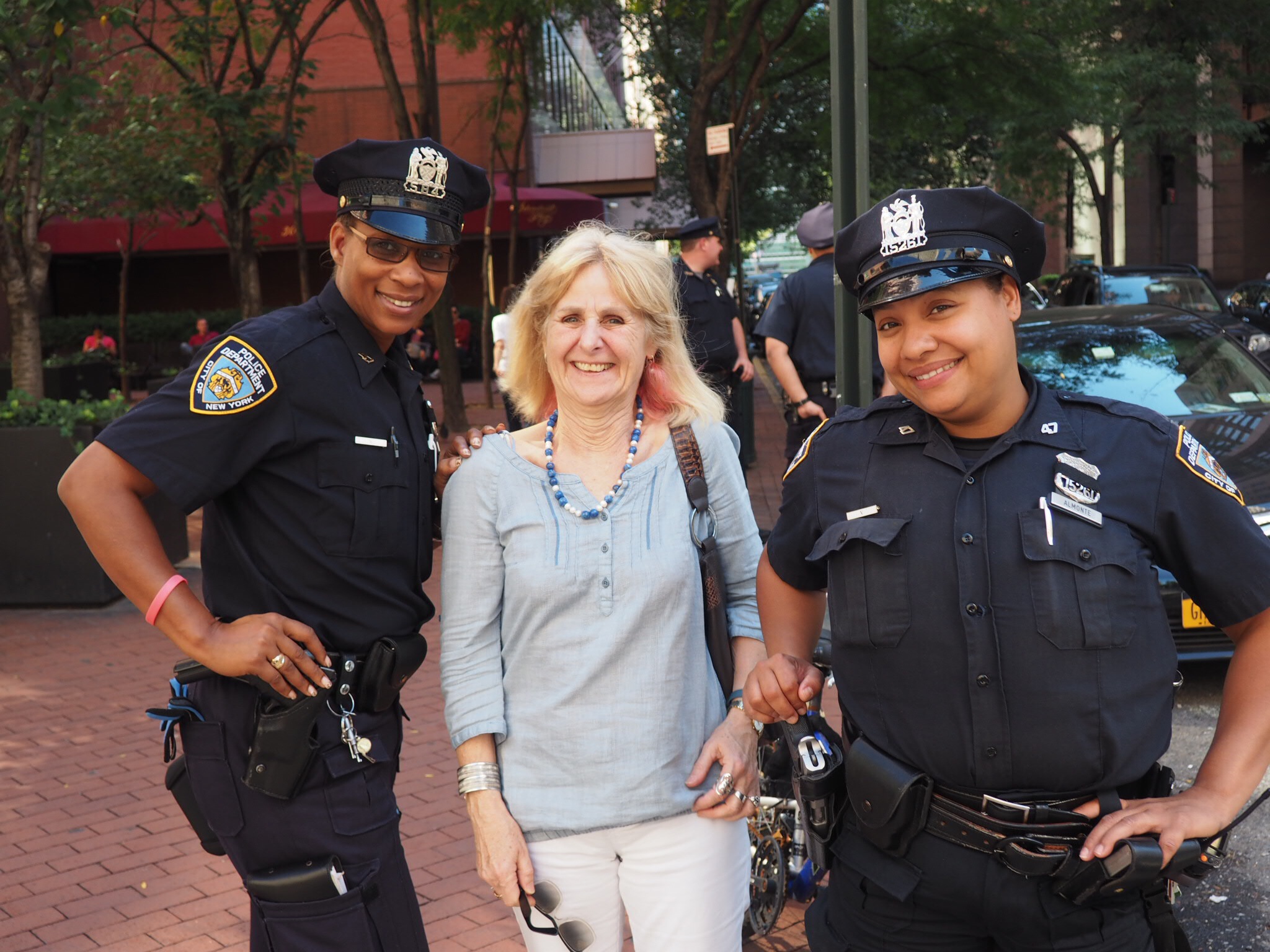 It’s pleasantly warm and sunny. We set off walking to the United Nations building which is on our street all the way East. We get almost there to find the roads blocked by temporary fencing guarded by lots of NYPD. One of the friendly cops guides us to where we can get a better view of the building, but we still ca