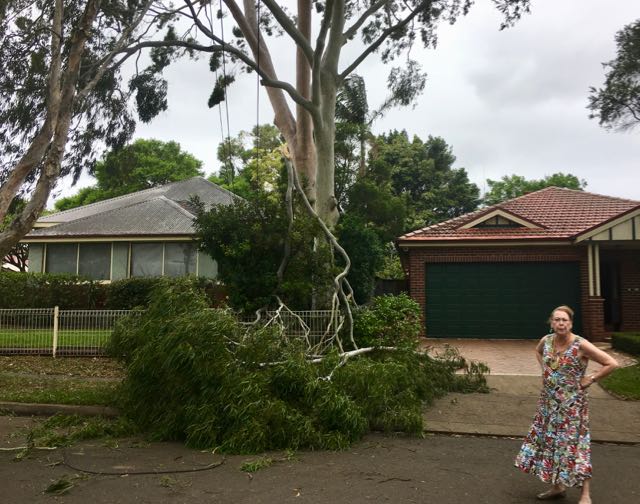 It was still very hot yesterday, so we dined in airconditioned comfort at Fratelli in Majors Bay Road. We came out of the restaurant to find the cool change had arrived with some big wind gusts. Chris drove us home where we found a huge bunch of branches had fallen from next door’s towering gum tree into our drive. It had missed all the power lines, thankfully, but had snapped our